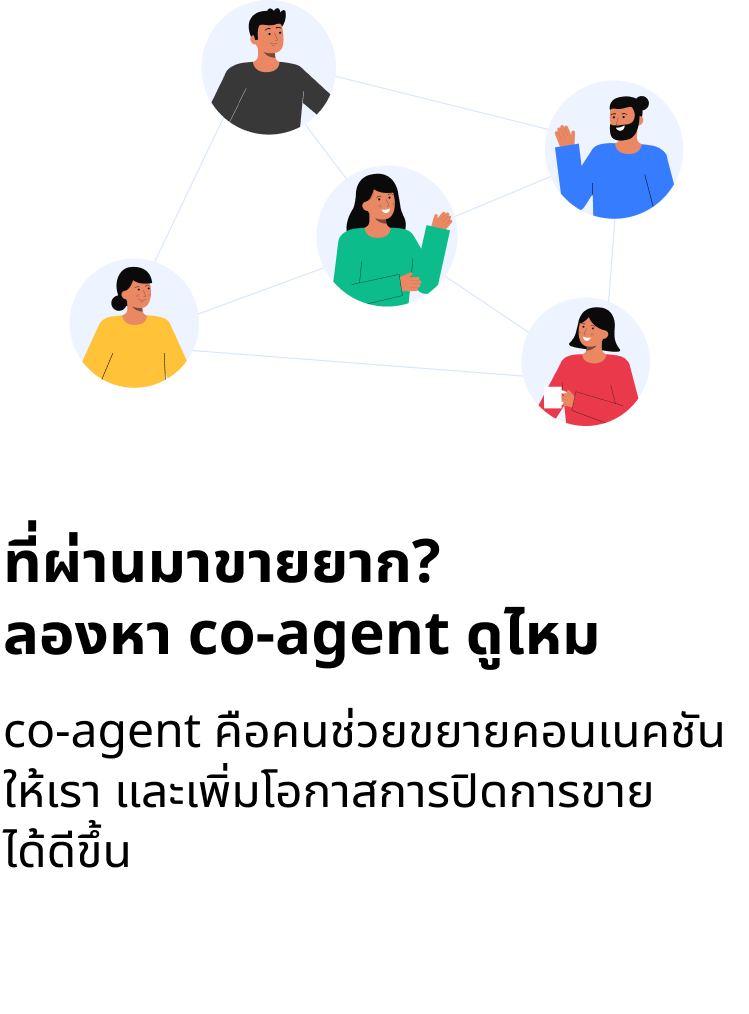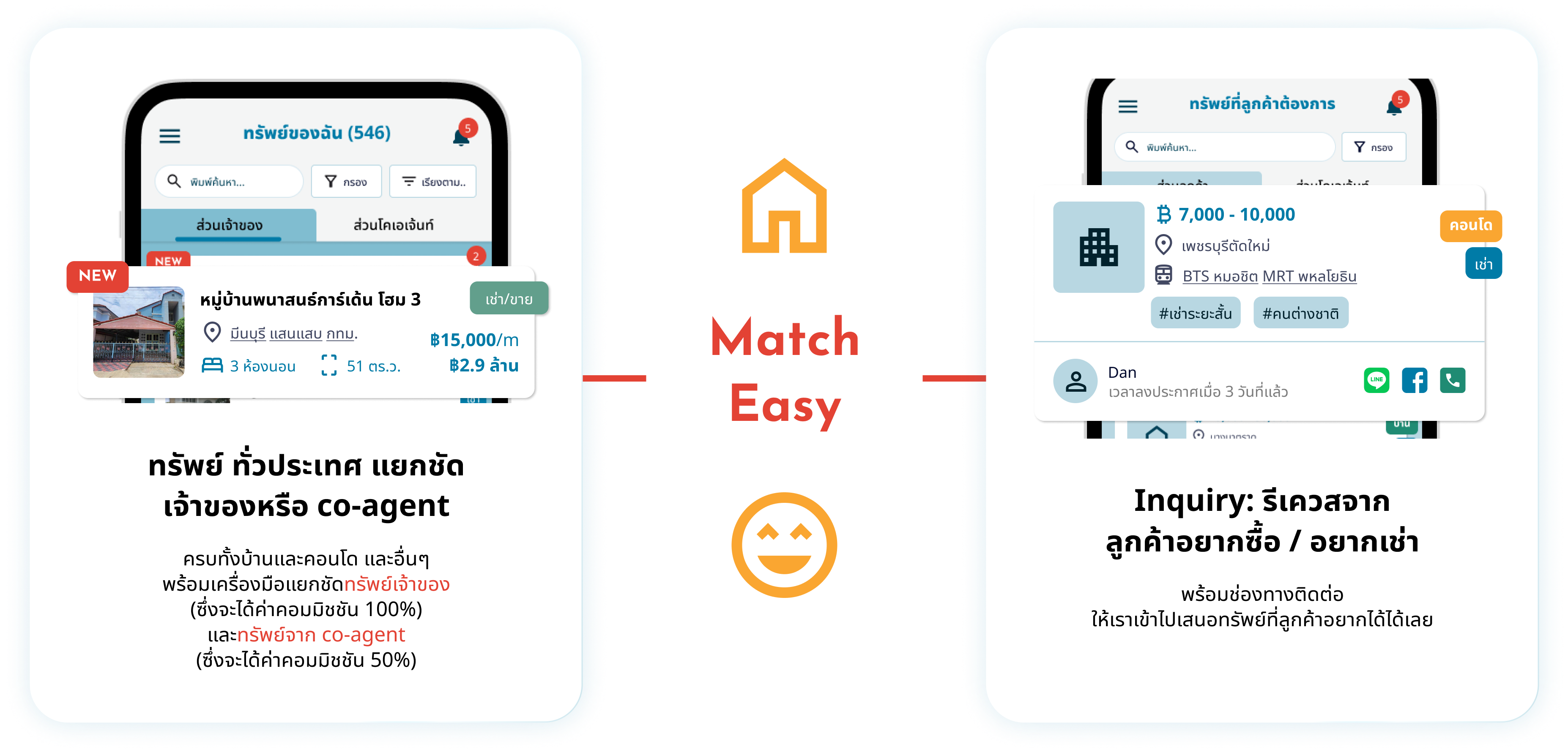 - เไม่ต้องเริ่มจาก 0 แต่เริ่มจาก 1000 : เป็นนายหน้าแรก ๆ ต้องดีลทรัพย์เอง จัดเก็บเอง ทำแค่นี้ก็หมดเวลาหาลูกค้าแล้ว เราจึงได้รวบรวมทรัพย์จากเจ้าของมาให้คุณไว้ที่เดียวแล้ว เริ่มทำการตลาดได้เลย ส่วนฐานลูกค้าก็มีให้แล้วเช่นกัน นำ 2 ฝั่งมาชนกันได้เลย
